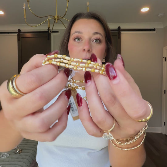 With rich gold accents and faceted yellow hued beads, The Aura Stack adds a radiant pop of color and shine to any look. Lightweight, versatile, and perfect for layering. This set features three stretch beaded bracelets.