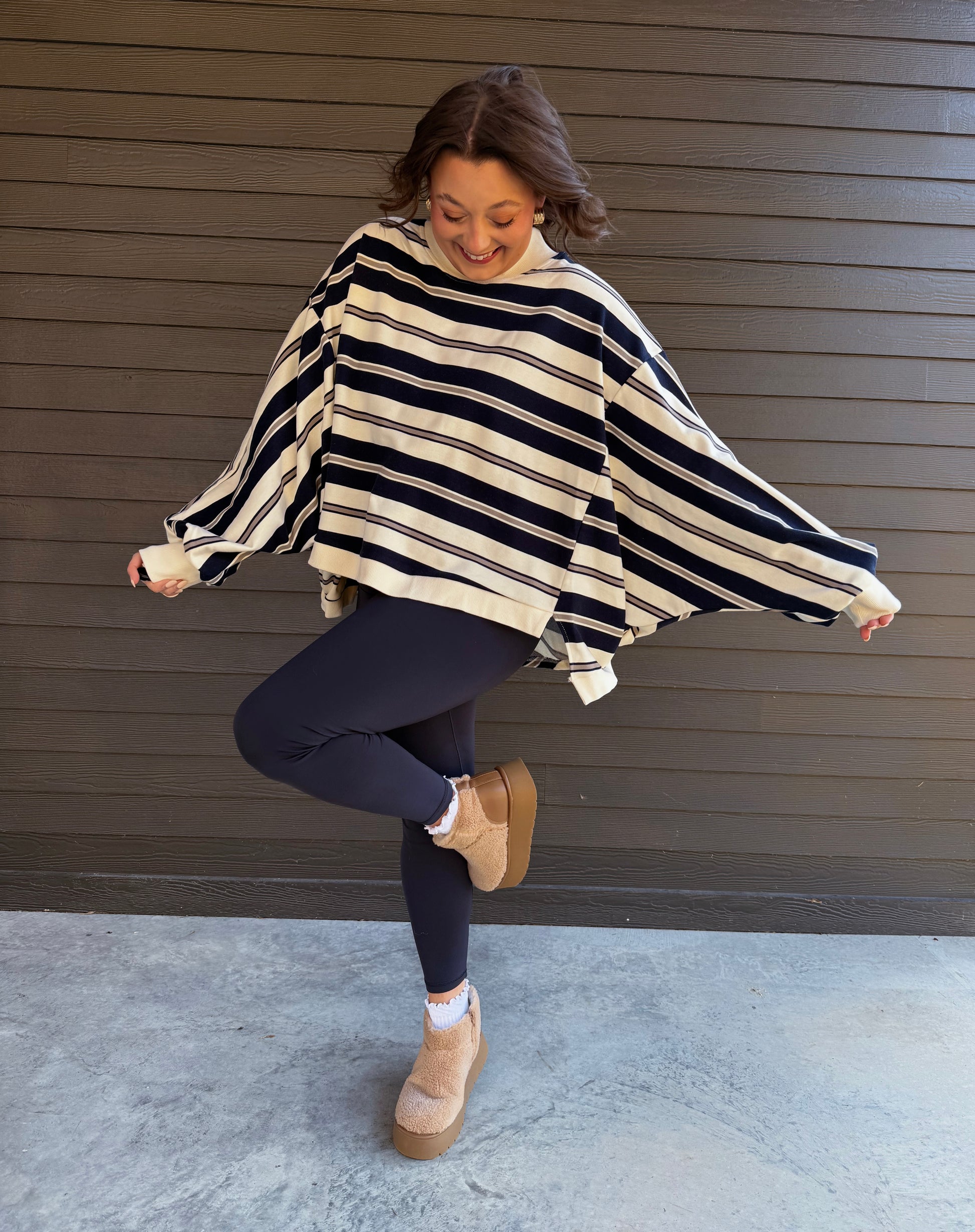 Cozy meets classic in this striped mock neck sweatshirt. With its relaxed oversized fit and soft knit fabric, it’s the perfect throw on piece for weekend getaways, coffee runs, or cabin mornings.