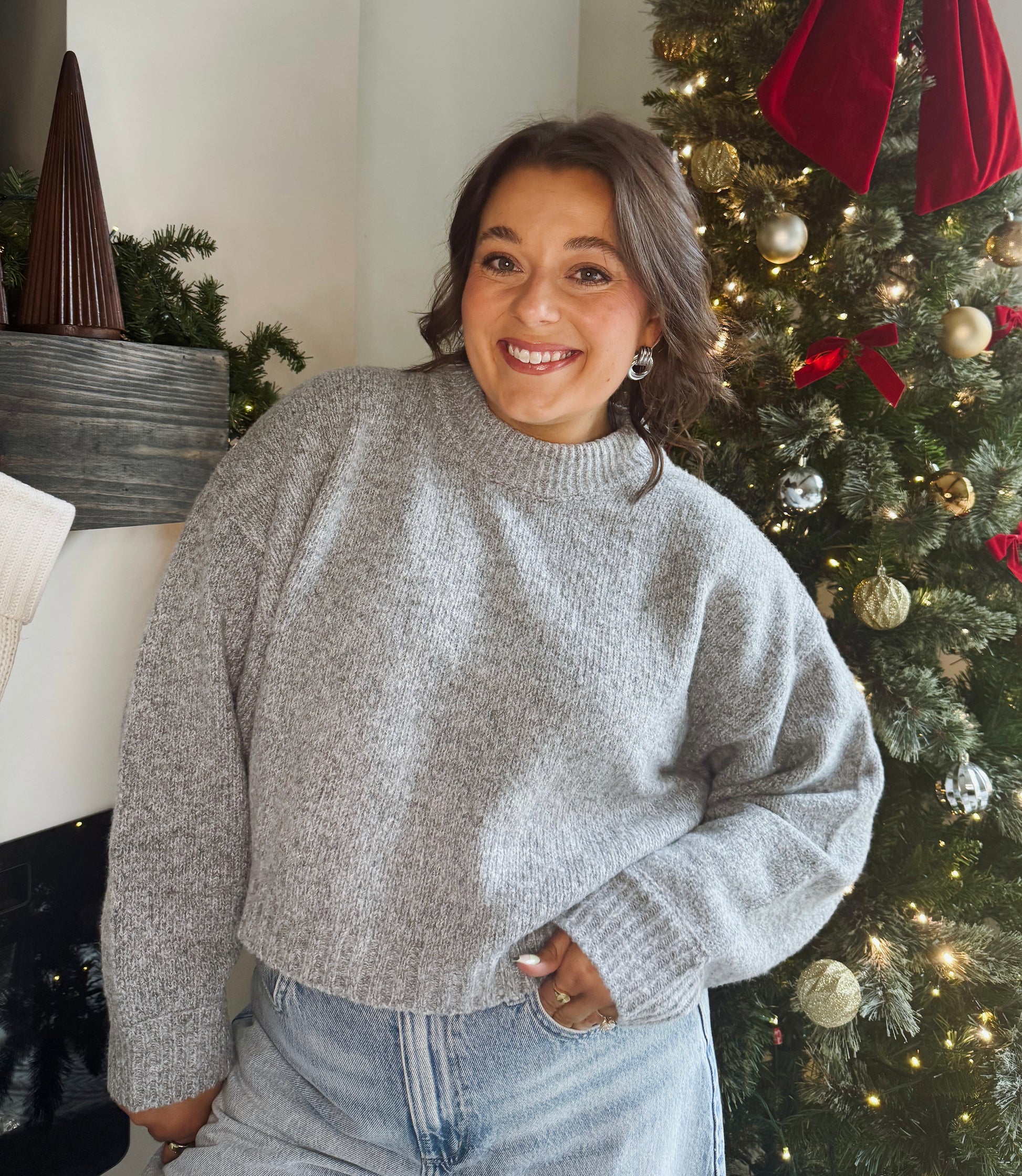Soft, cozy, and effortless. This heather gray knit features a relaxed fit with a slightly cropped length, making it perfect with high waisted denim. An easy everyday sweater you'll reach for all season long. Perfect with your favorite high waisted jean or skirt to dress it up.