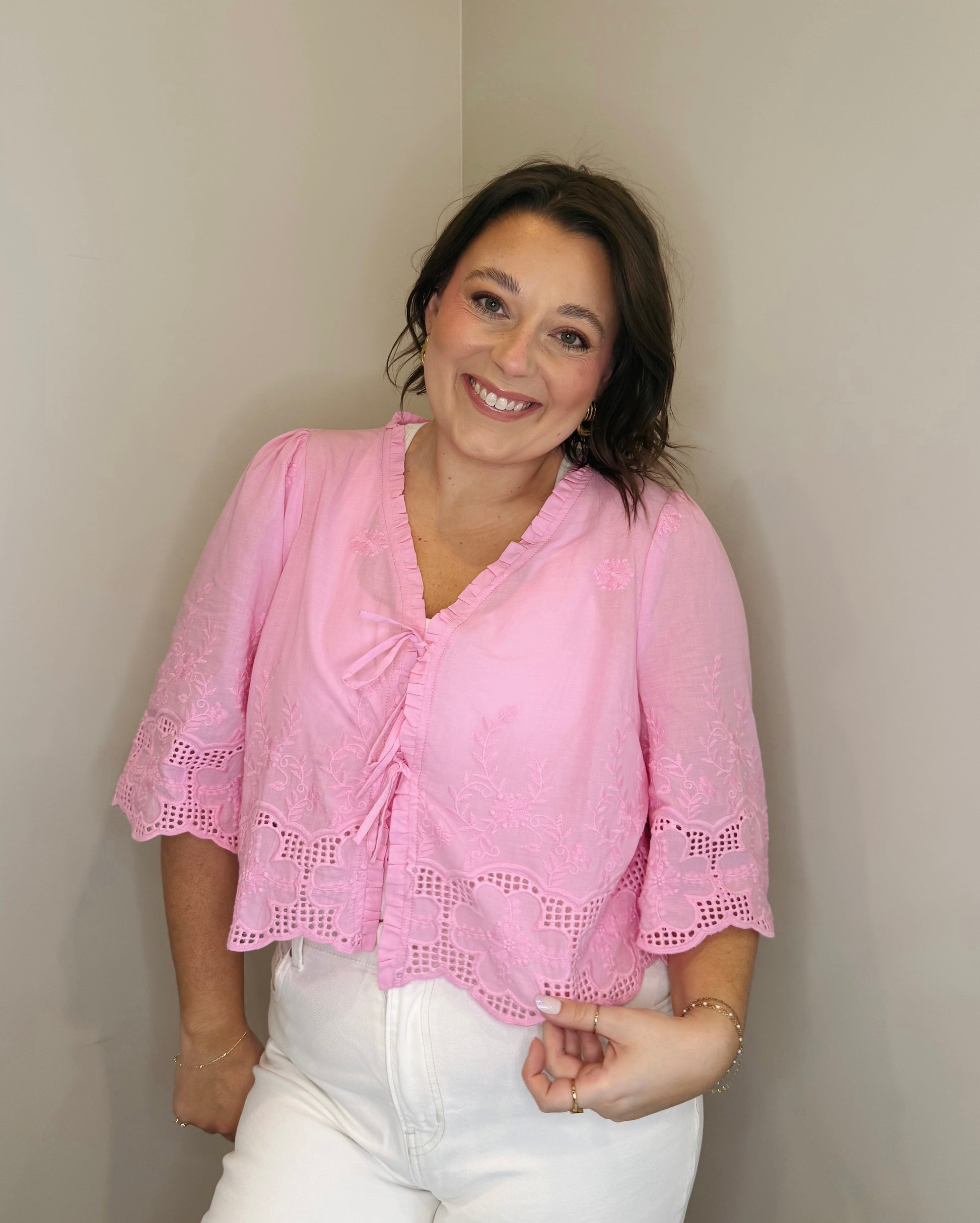 Feminine and flowy, The Morgan Top is all about the details, featuring a scalloped hem, eyelet embroidery, and tie-front closure. Style it with denim for an effortless boho vibe or layer it over a bralette for a flirty finish.