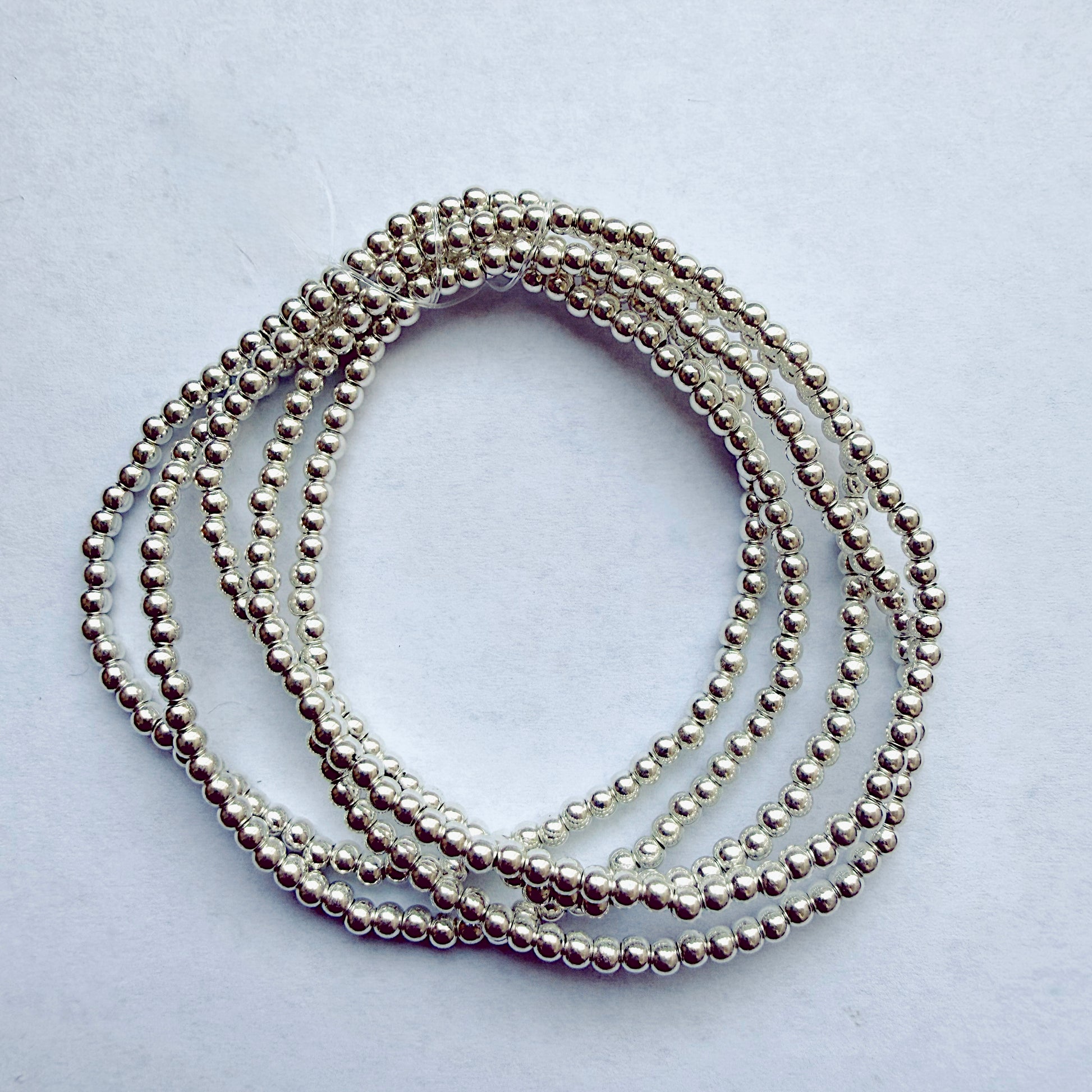 Delicate yet versatile, The Starlight Stack is a set of five silver beaded stretch bracelets designed to shine on their own or layer with your favorite pieces.