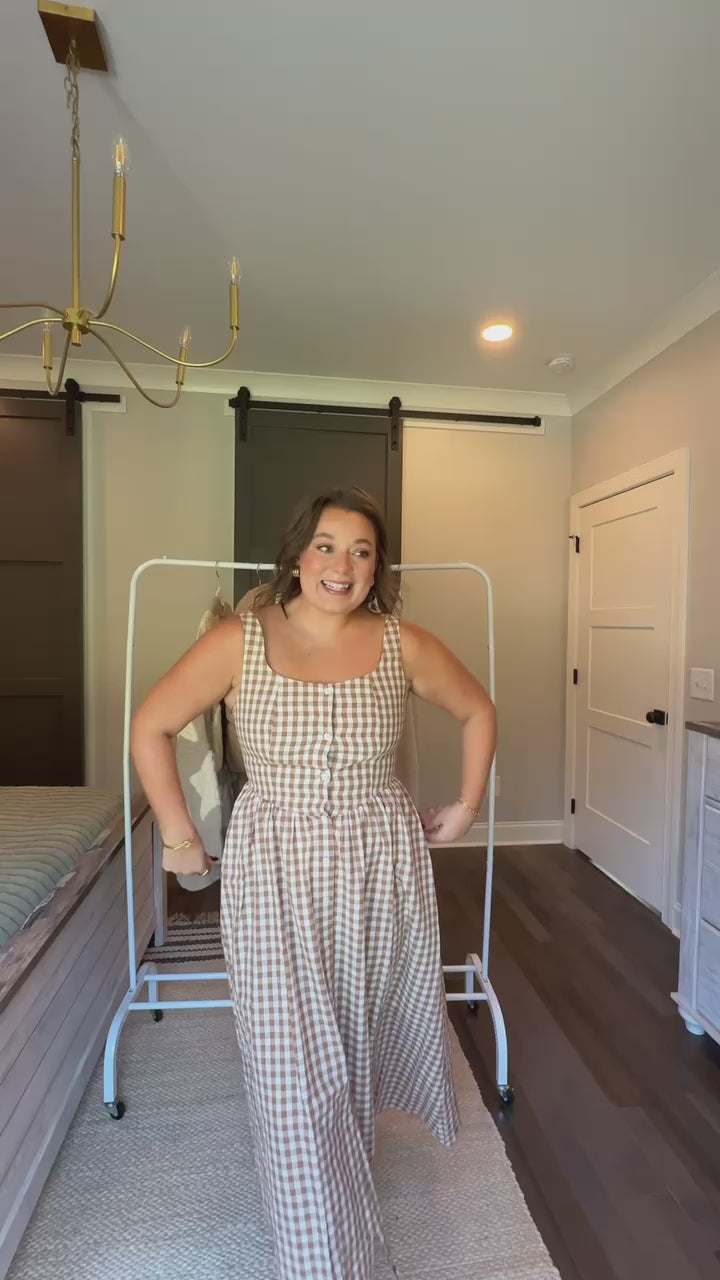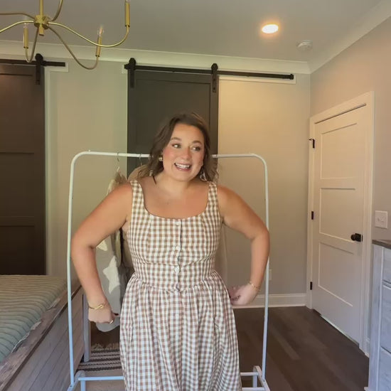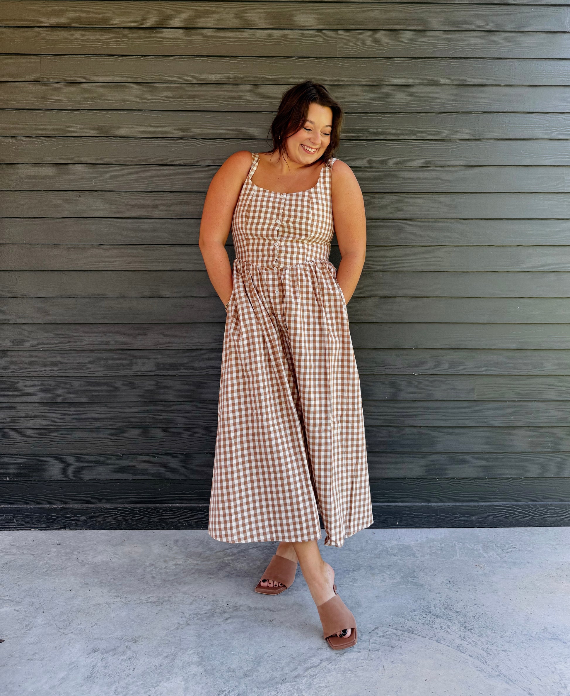 A timeless rust and ivory gingham midi with a square neckline, button front detail, and flowy skirt. Lightweight, versatile, and finished with pockets. The perfect dress for any occasion; family photos, Thanksgiving dinner, or a brunch.